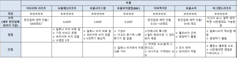 2) 알로나 비다 비치 힐 리조트 (Alona Vida Beach Hill Resort): 3성급. 1박 7만 정도. 알로나비다비치리조트 낮은 급인 듯 합니다. 간판이 작아 찾기 힘들다고.(팡라오리젠트호텔 근처라고) 알로나비치에서 걸어서 10분 거리. / 단점: 방음 잘 안됨. 침대가 작은 편.